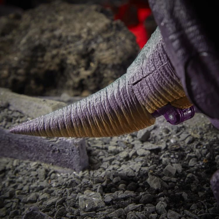 Megatron toy converts into a Beast Wars-inspired T. rex mode in 27 steps. Figure’s dino head and tail become his classic claw hands. Add laser fire effect by placing Fire Blasts accessories inside dino head (sold separately with other figures, subject to availability).